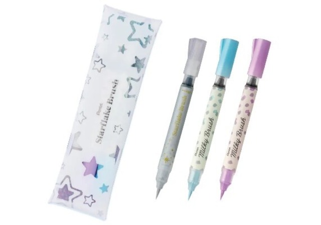 星屑のような輝きをプラスする、グリッターだけの筆ペンが限定登場! 文字やイラストに重ねるだけで手描きの表現が目を引く印象的な仕上がりになります。 ■限定セット1 スターフレークブラッシュ シルバー/ミルキーブラッシュ パステルブルー/ミルキーブラッシュ パステルバイオレット