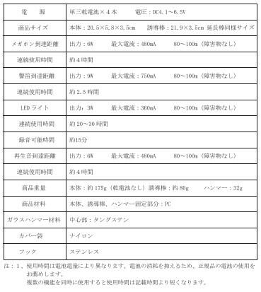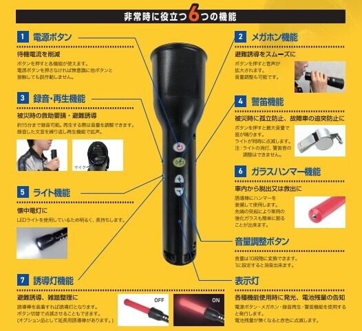 ①ライト機能・②誘導灯機能・③メガホン機能④警笛機能・⑤録音・再生機能・⑥ガラスハンマー機能