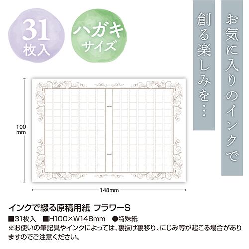 お気に入りのインクで創る楽しみを。1ヶ月間毎日使える原稿用紙31枚入り。文字の練習や日記、SNSでの書写の投稿にもおすすめです。収納しやすいハガキサイズ。滲みにくく裏抜けしにくいこだわりの用紙は、すりガラスのような透け感と硬い書き味が特徴です。万年筆やつけペン、ガラスペンで書くのに最適です。美しいレリーフ柄部分は、模様をなぞったり描き足すなどして楽しめます。12字×14行の168字詰めです。