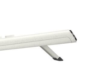 さまざまな利用シーンに調和する、環境にも配慮した電卓。スマートな英語表記仕様。座っても、立っても打ちやすい開閉式スタンド付き。
