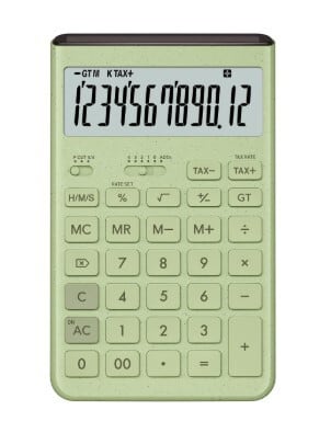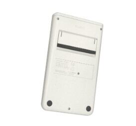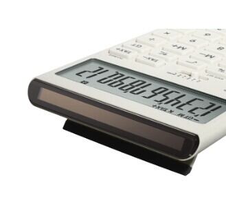 さまざまな利用シーンに調和する、環境にも配慮した電卓。スマートな英語表記仕様。座っても、立っても打ちやすい開閉式スタンド付き。