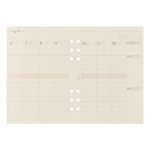能率手帳の会社がつくるシステム手帳ブランドBindex by NOLTY (バインデックス バイ ノルティ)のリフィル(A5サイズ)。 30分刻みの時間管理が可能なバーチカルタイプ。 1週間のメインテーマやチェックリストの記入欄付。