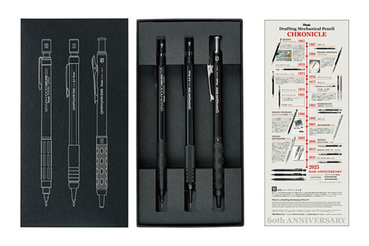 2025年のぺんてるの製図用シャープペンシル発売60周年を記念して、発売以来愛されてきたロングセラー商品である「グラフ1000〈フォープロ〉」「グラフギア500」「グラフギア1000」の3種の限定モデルを発売。